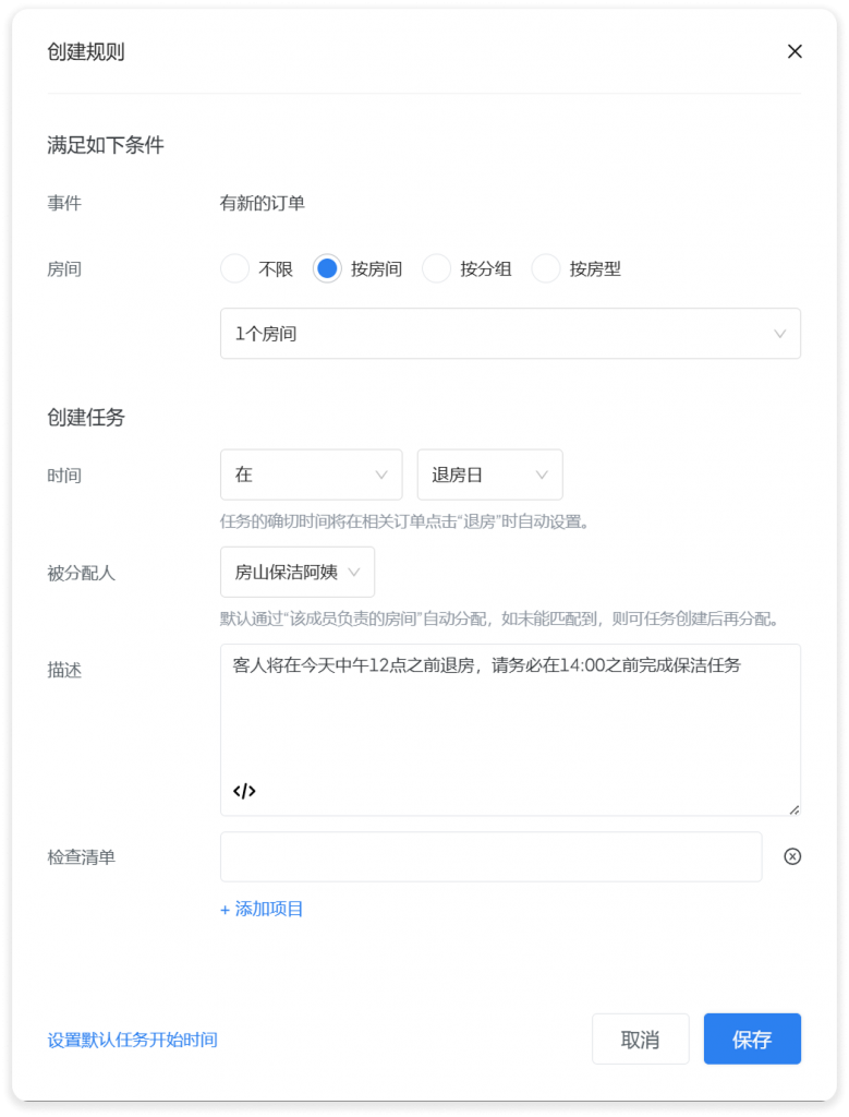 在民宿管理软件百居易中创建好相关规则,每次一有新的订单,就可以按照创建的相关规则自动生成保洁任务,分配并通知给对应的保洁人员。