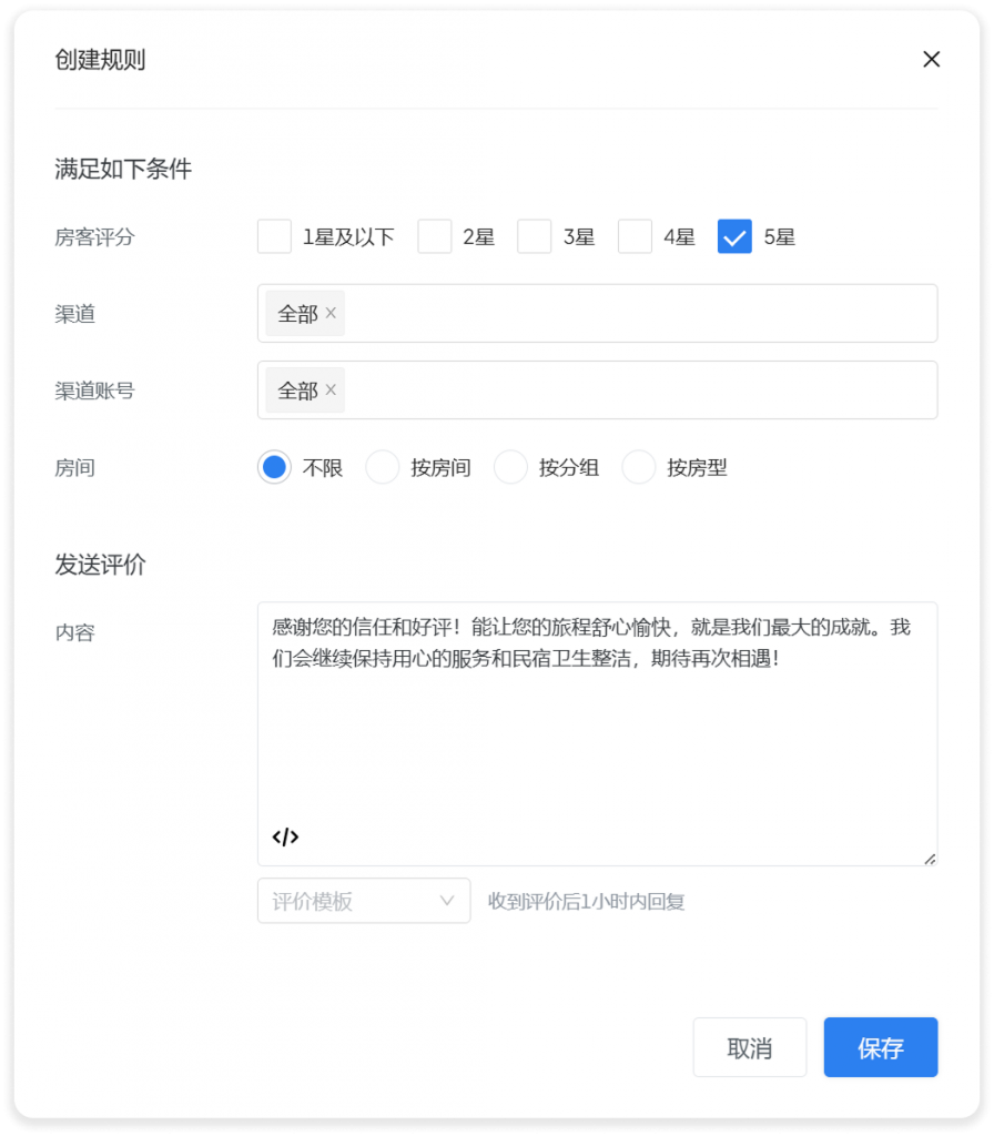 使用百居易的自动回复评价功能,房东只需要按照客人评价的不同星级,设置不同的回复模板。AI会以模板为基础,撰写不同的文案自动发送给每位客人,真正做到解放双手。