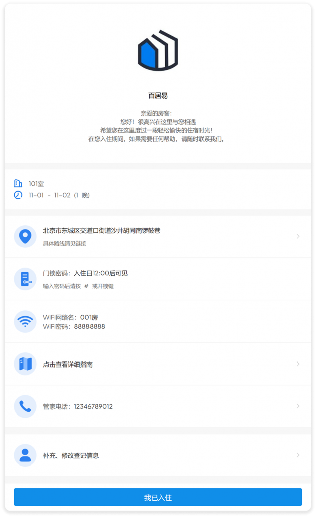 百居易可以帮助房东朋友们设置一个全面的入住指南,并将如何进入房间、连接WiFi、使用家电、停车等信息自动发给房客,房东不用再反复给不同房客发送同样的信息。