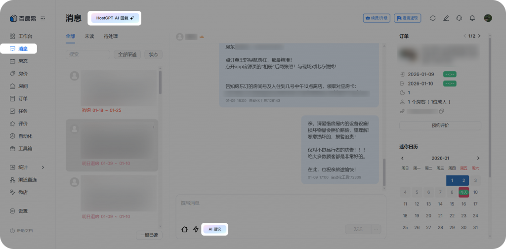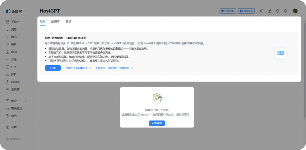 在百居易网页版5.0.0版本中,我们正式推出了全天候自动回复AI助手HostGPT,配合一系列专业级管理功能,助力房东实现从全方位的智能管理。