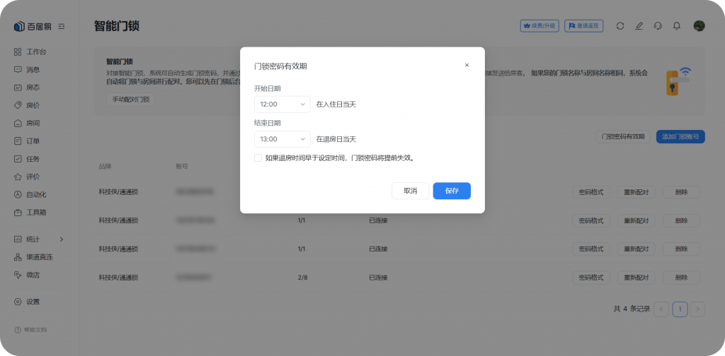 - 优化门锁密码管理:支持设置密码有效期,并添加“如果退房时间早于设定时间,门锁密码将提前失效”选项,勾选后,若订单在有效期结束之前退房,则自动将门锁密码删除。
